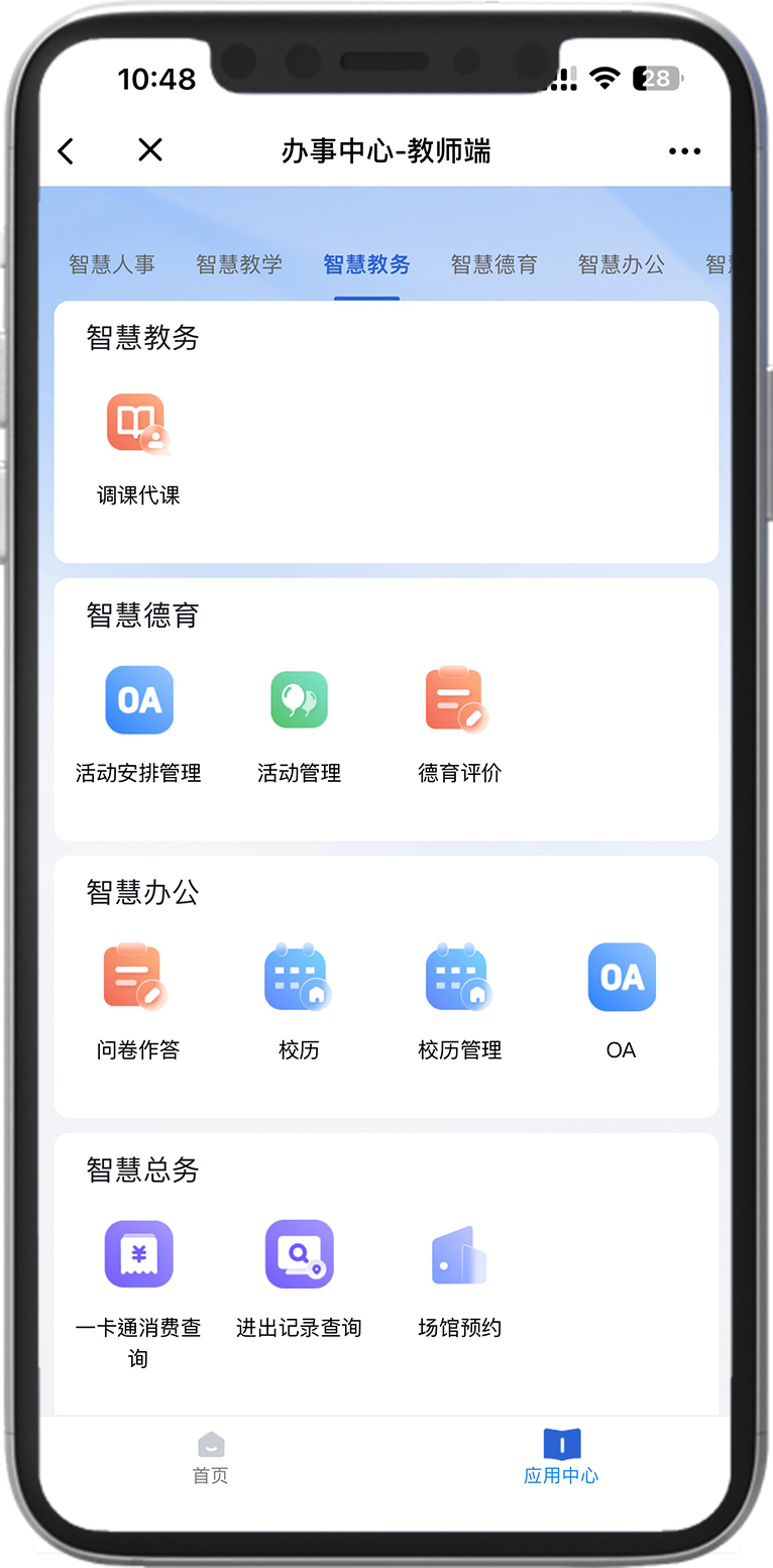 包含智慧德育、教务管理、OA协同办公、档案管理等多模块应用,通过微服务架构独立部署,实现学校业务应用快速响应。